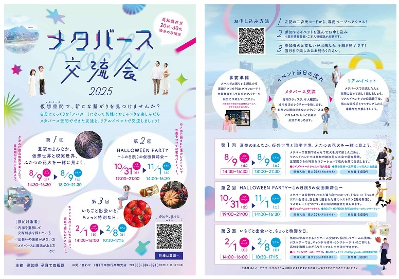 「メタバース交流会」は、高知県在住の20代30代向けの婚活イベントです。計3回行われ、第1回は8月9日、第2回は10月31日、11月1日、第3回は2月1日、8日。どちらもメタバースの回、リアルの回に分かれています。