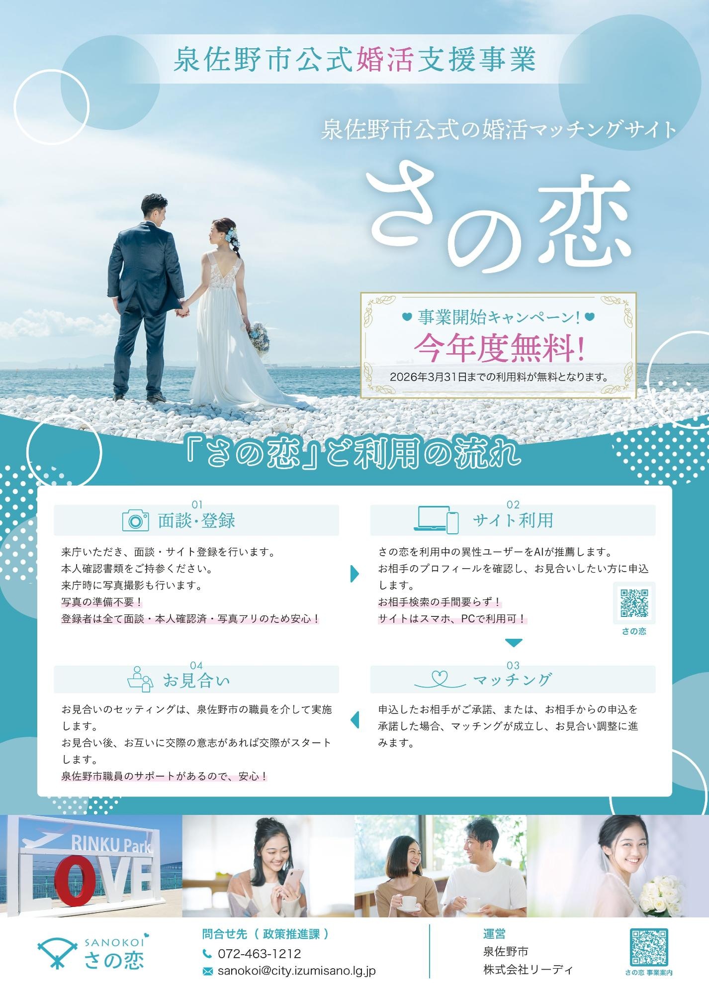 「さの恋」は大阪府の泉佐野市公式の婚活マッチングサイト。令和6年8月1日よりオープンしたサイトです。地域の結婚を応援するために生まれ、大阪府泉佐野市に住む人はもちろんですが、大阪府民や府外の人も登録できます。