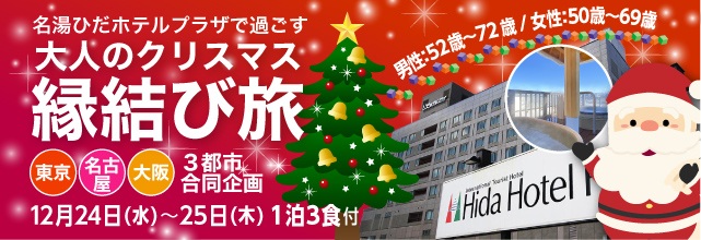 婚活バスツアーのハピネスツアーが、季節にぴったりのツアーを開催。それが、「大人のクリスマス縁結び旅」。2025年12月24日、25日の2日間、開催され、東京、名古屋、大阪の3都市合同企画。みんなが名湯ひだホテルプラザに集まります。